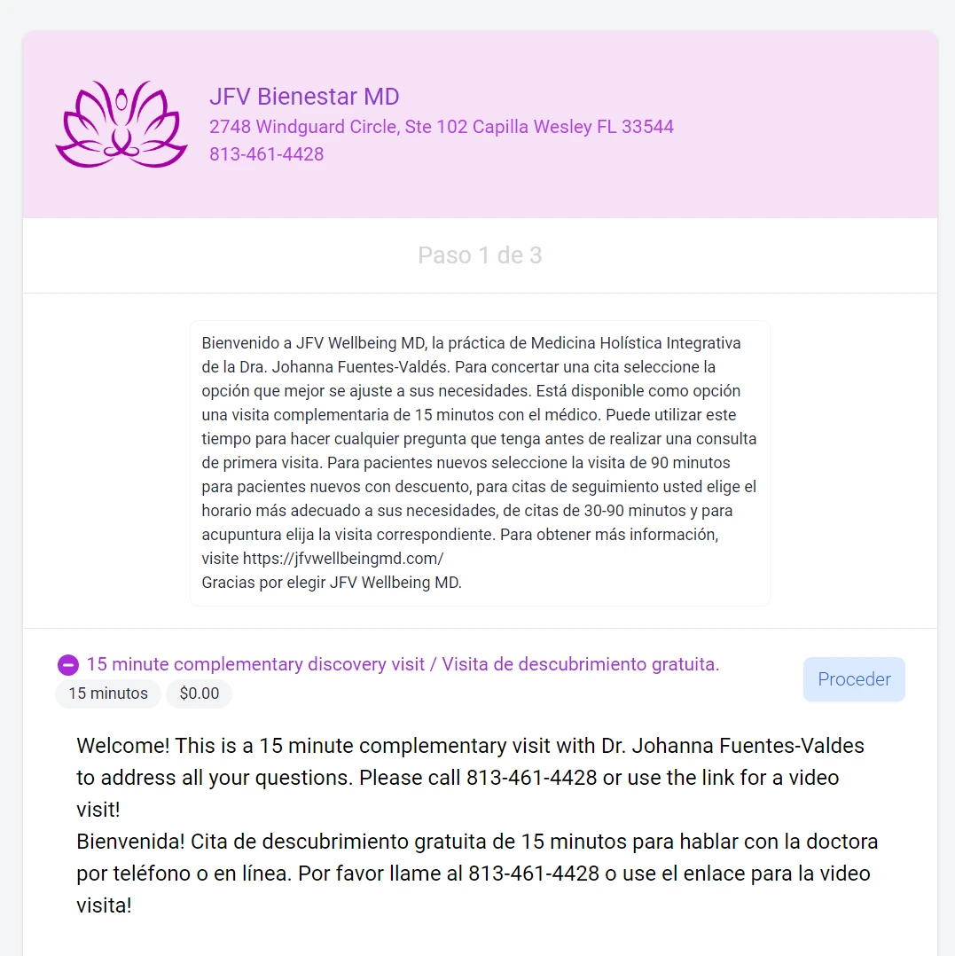 9. Tome en cuenta que todo el contenido será traducido al español, incluso la dirección de nuestra clínica. Si necesita la dirección correcta en inglés por favor vuelva a nuestra página web donde la encontrara con la localización en el mapa. En la siguiente imagen se puede ver la pagina traducida para agendar su cita.