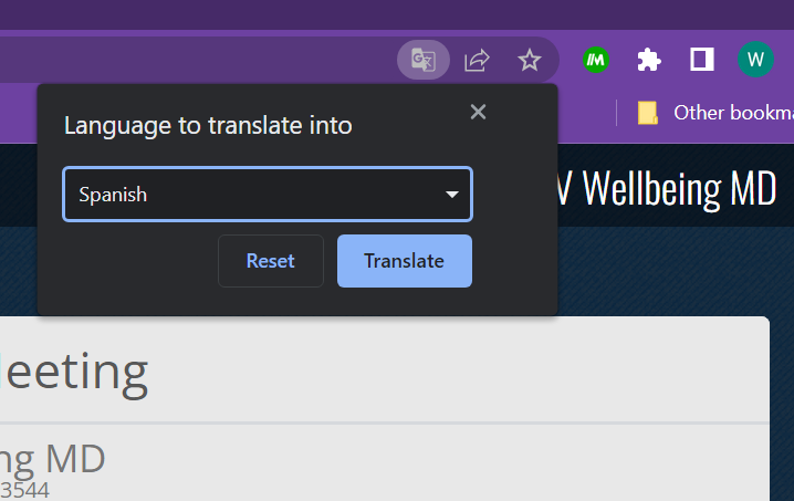 Por favor siga las instrucciones para traducir al español el contenido de la página web de “Optimantra” y las formas que hay que llenar para su visita, utilizando el traductor de Google. Esta opción solo está disponible en el navegador de la red “Chrome” en su computador. Las capturas de pantalla a continuación le ayudaran con los pasos a seguir.